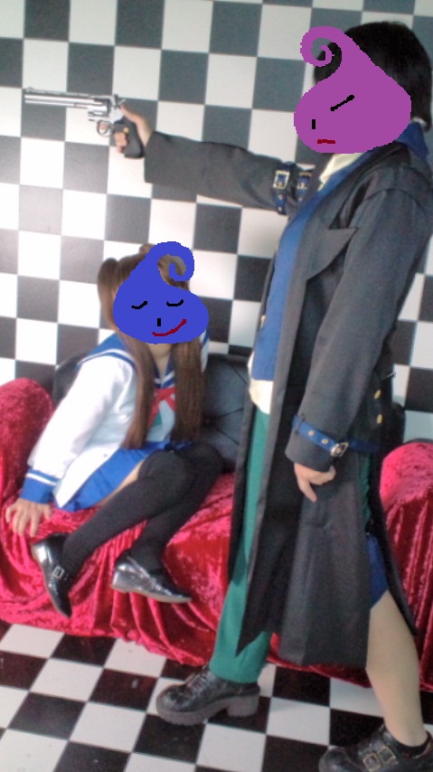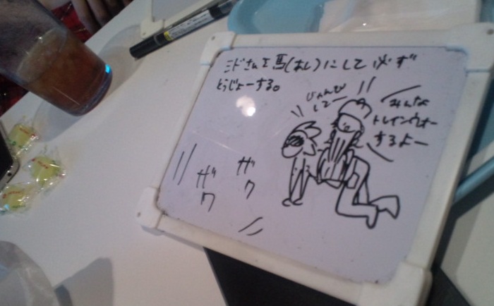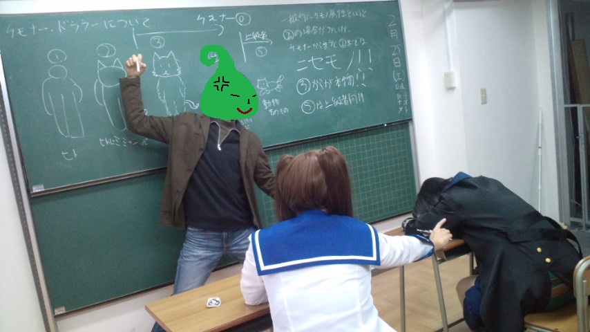 使用方法を熟読。血糊は禁止事項でした。やっちゃダメヨ(何)間違って先走って自己紹介してしまった自爆。ブルァァ!みんなで自己紹介のあと、ニト殿扮する小竹さんが、黒板の前に立って先生役。要ちゃんにナオトさんは生徒。わたくしは生徒兼撮影。