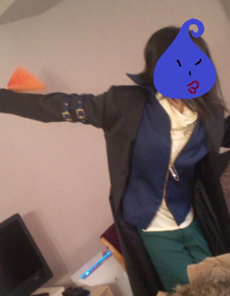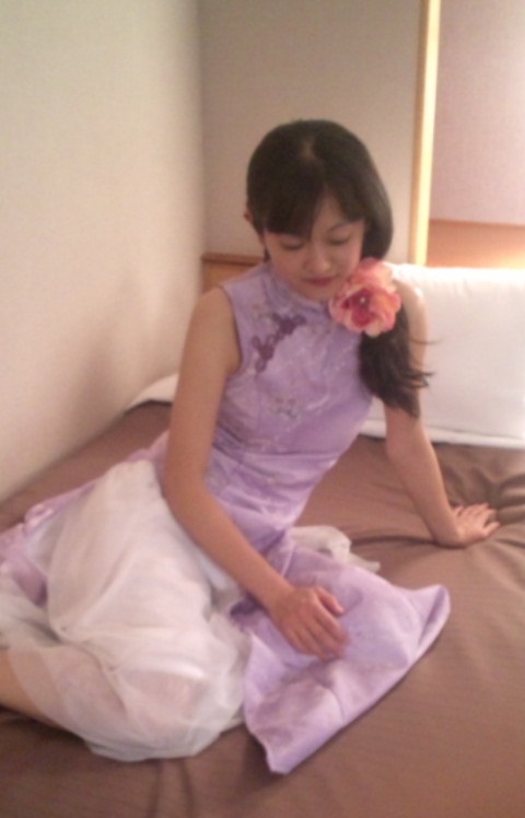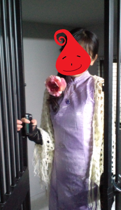 ↑背中のコンシールファスナーと首元の失敗具合がばっちり写ってしまった!襟は、細かく直す時間が無かったので花のコサージュでごまかしています(汗)