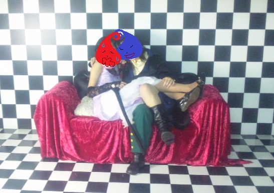 クイズの後はカラオケ祭り。ニト殿が到着して、早速コスプレくじを引かされる。快く便乗して下さった!