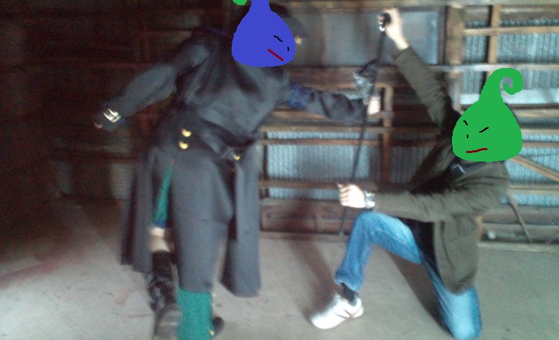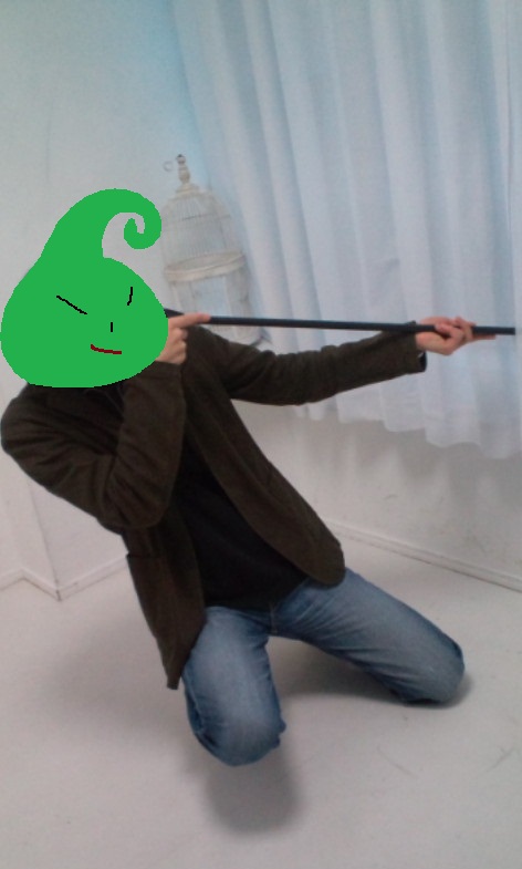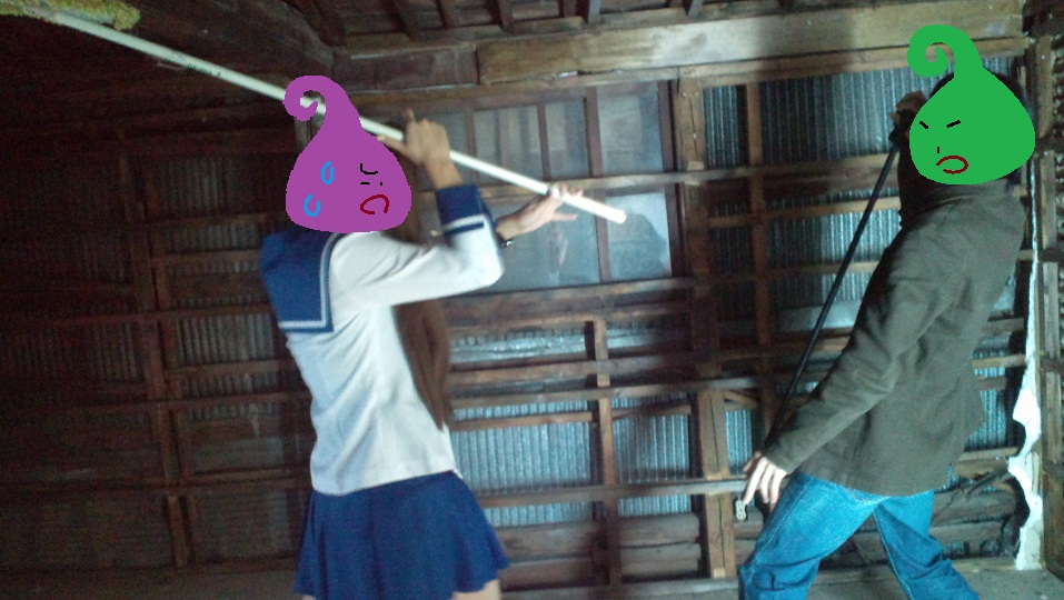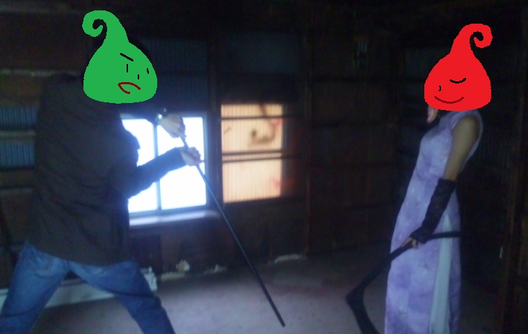 ニト殿は撮影機材の長い棒を借りて武器変わりに。要ちゃんはスタジオ掃除用のモップを代用。私の鎌は布製。ナオトさんの銃は自前。このキャラだったらまずこう動くとか、逃げるとかヘタれるとかPC談義で盛り上がりながら撮影会。