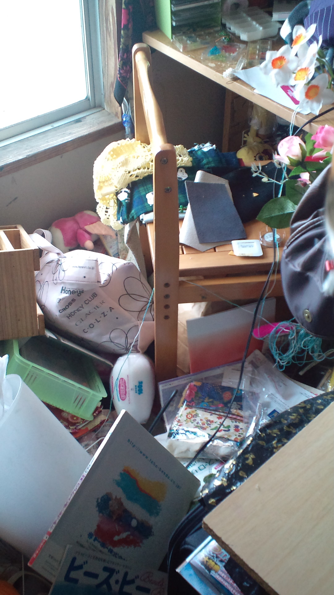 私の机の周りがぐしゃぐしゃだった。手芸用品が地獄絵図。