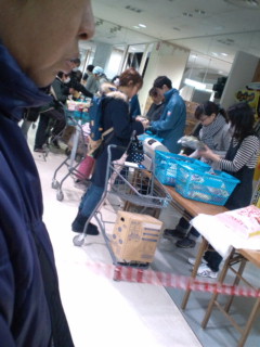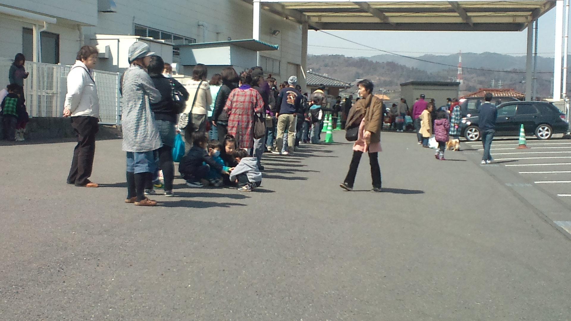 会社のおじさん達は、料理を作ったり携帯テレビを観ていた。夜の間に土を掘って、簡易トイレを作ったらしい。おじさんが、スーパーの食料品がほとんどないと言っていた。