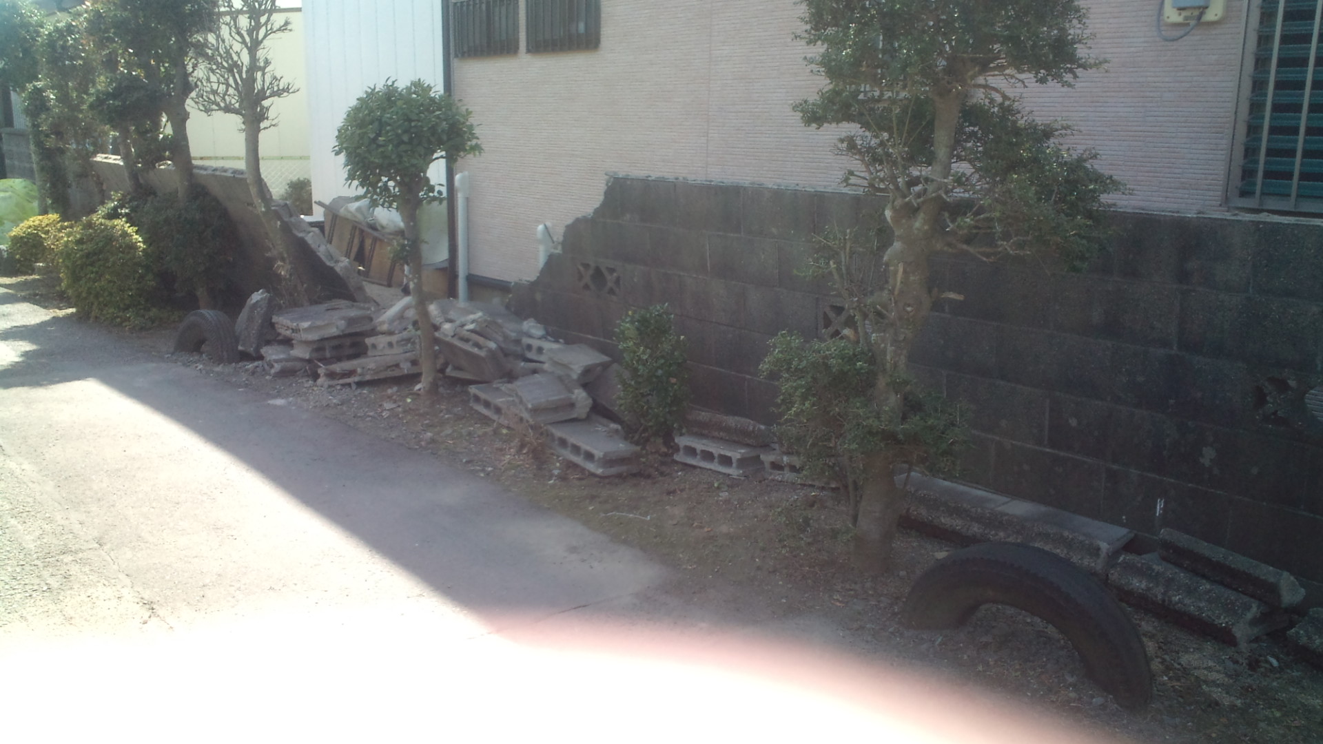 建物中の窓という窓がバンバンと何かで叩かれるような音が鳴っていた。ビルの中でガラスのようなものが割れる音、大きなものが倒れる音が外まで聞こえてきた。上から危険なものが降ってくるか、或いは建物の下敷きになってしまう恐怖があったが、私は近くのビワの木の下で頭を伏せたまま、動く事が出来なかった。