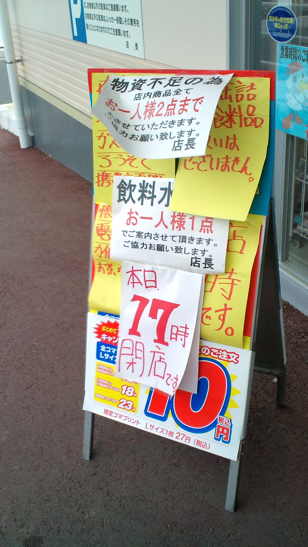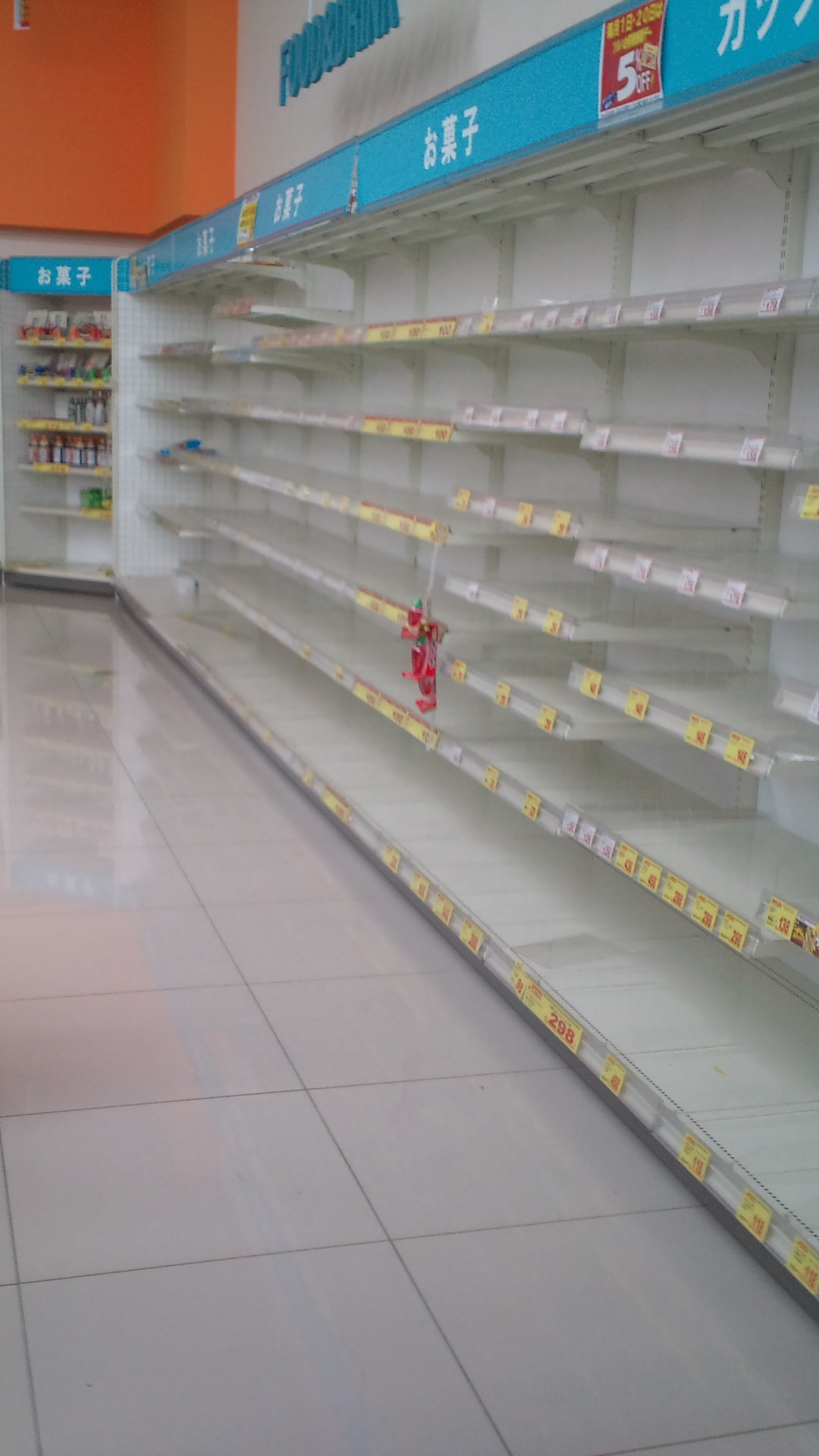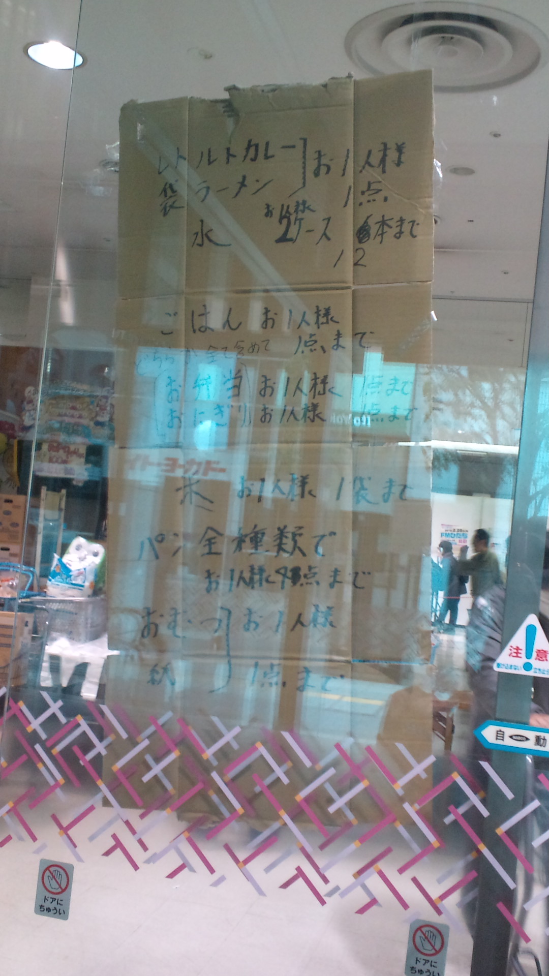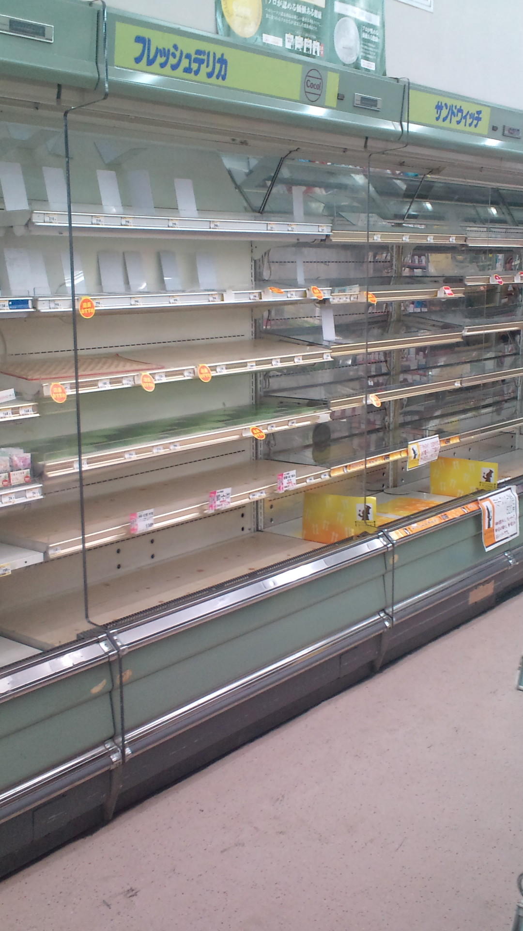 スーパーなどに行ってみたが、やはり凄い人の列だった。生鮮食品、米、飲料水が何処も品切れだった。カップ麺は少し入荷したらしい。母と祖母がヨーカドーの行列に並んでいる間、私は小さい商店をあたってみた。コンビニに行ってみると、お菓子も全て空っぽだったけど、納豆味のポテチだけが沢山残っていた。不味いのだろうか。パン屋に行ったらやっていて、人が沢山集まっていた。材料が不足している為、パンを焼くにも限りがあって、少ししか用意できないそうだ。後から買いに来た人の分が回らなかったが、先に買った人が分けていた。私はフランスパンを一本売ってもらった。助かりました、と伝えたら、お店の人に涙目でありがとうございます、と言われた。