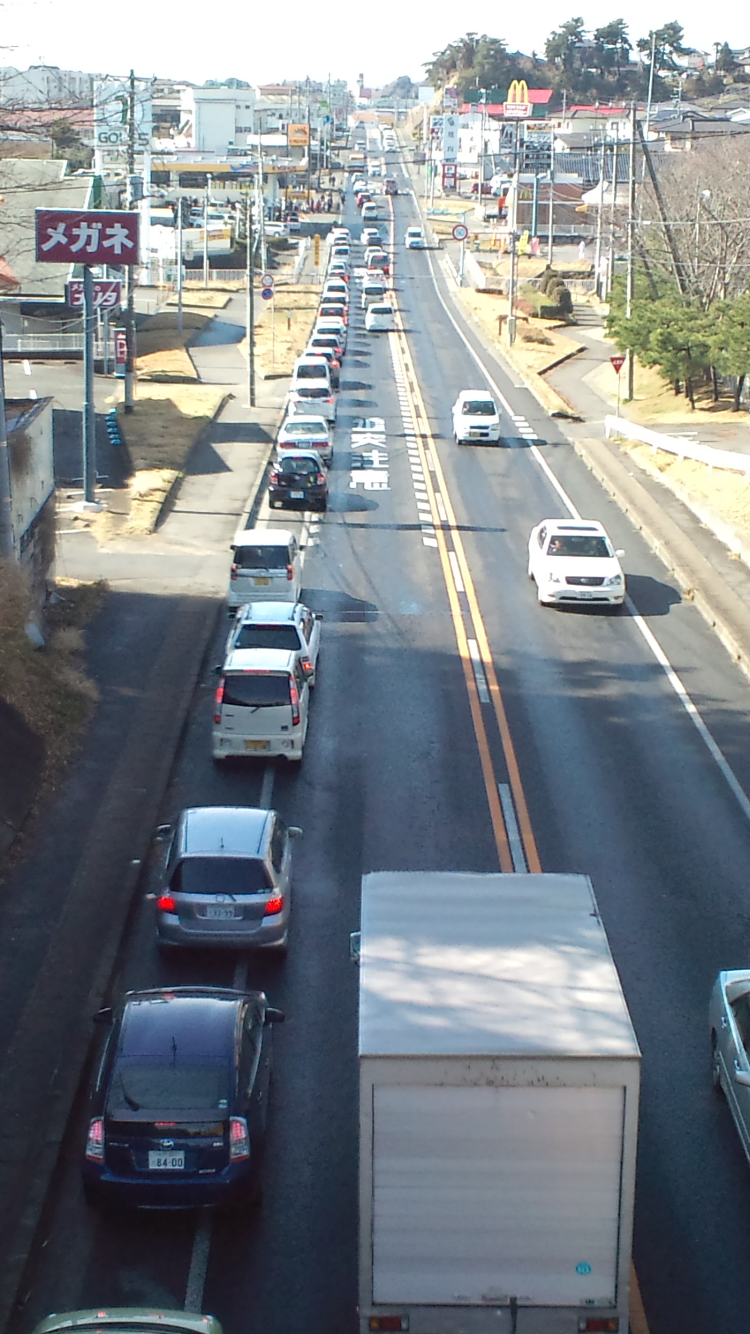 これは国道を橋の上から撮ったものだが、この渋滞は橋の反対側にもずっと続いている。スタンド近辺には赤いガソリンタンクを持った人が集まっている。