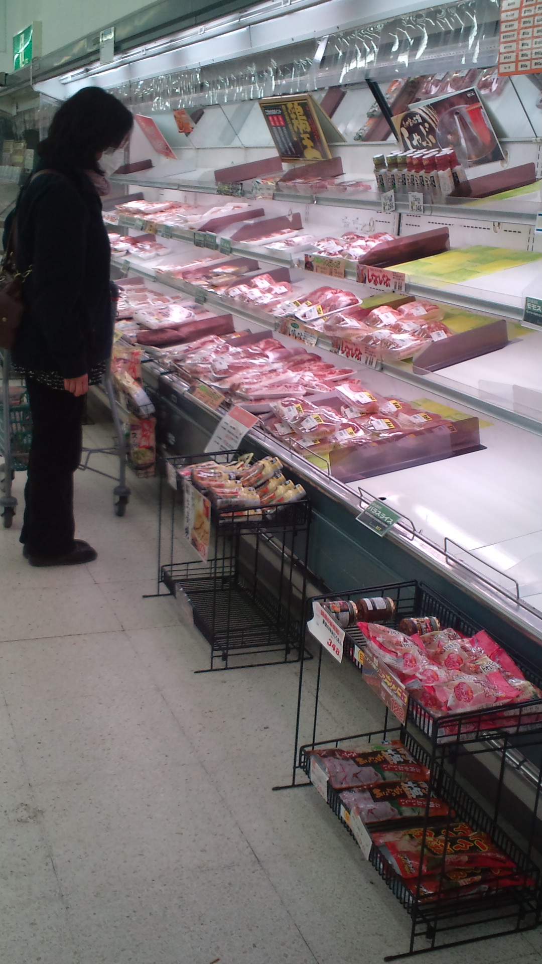 スーパーが開いてたので戦場覚悟で寄ったら、商品が結構充実してた。この時間帯で肉もかなり残ってた。空の棚も多かったけど、今まで見た中で一番食べ物が置いてあったと思う。少しずつ回復しているんだ、という希望の話