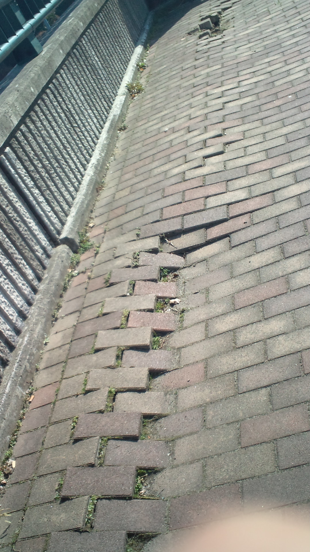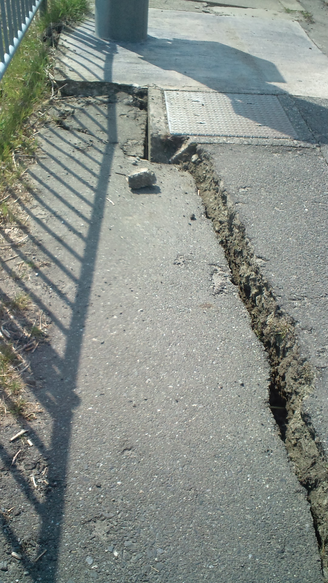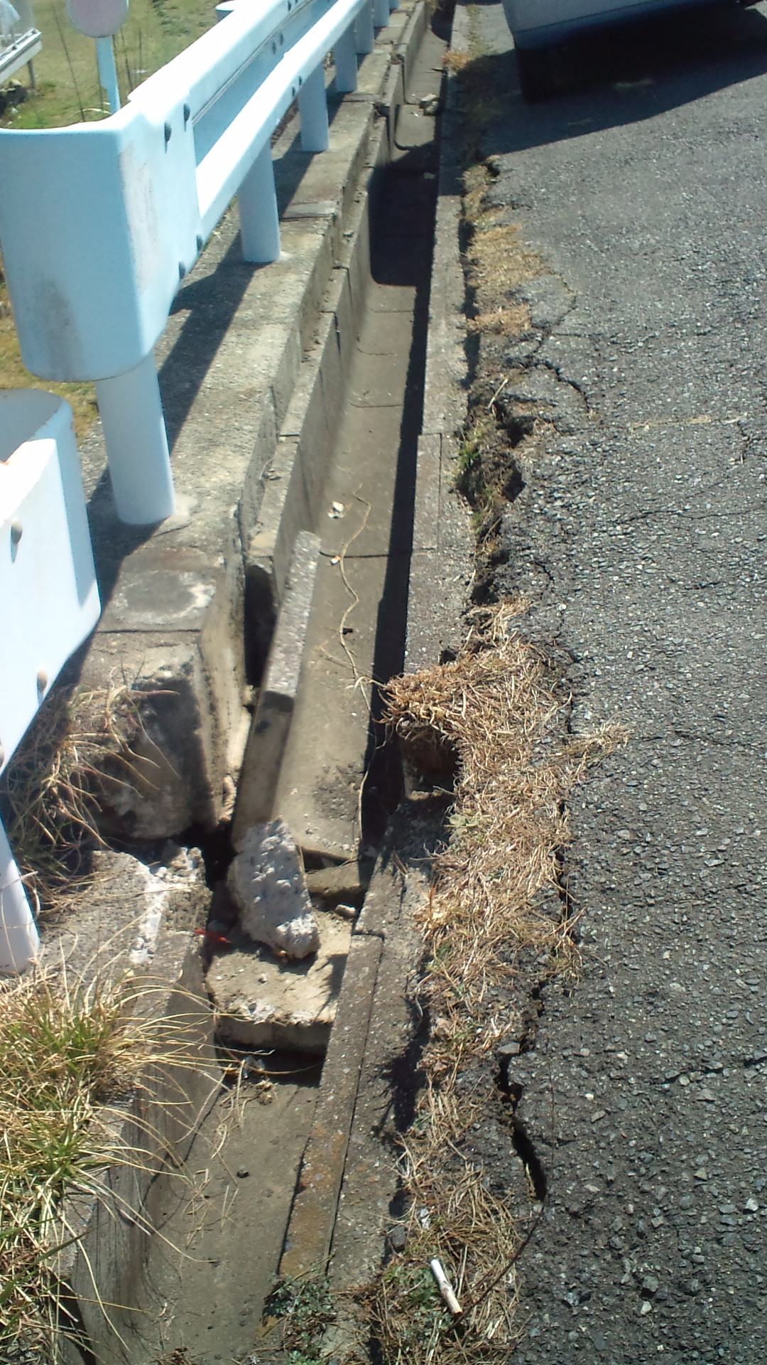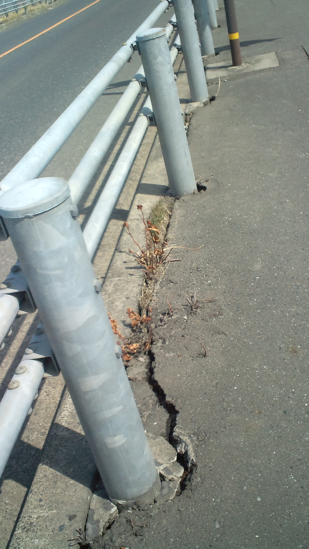 ガードレール下、歩道の亀裂が目立つ。隆起している所もあった。