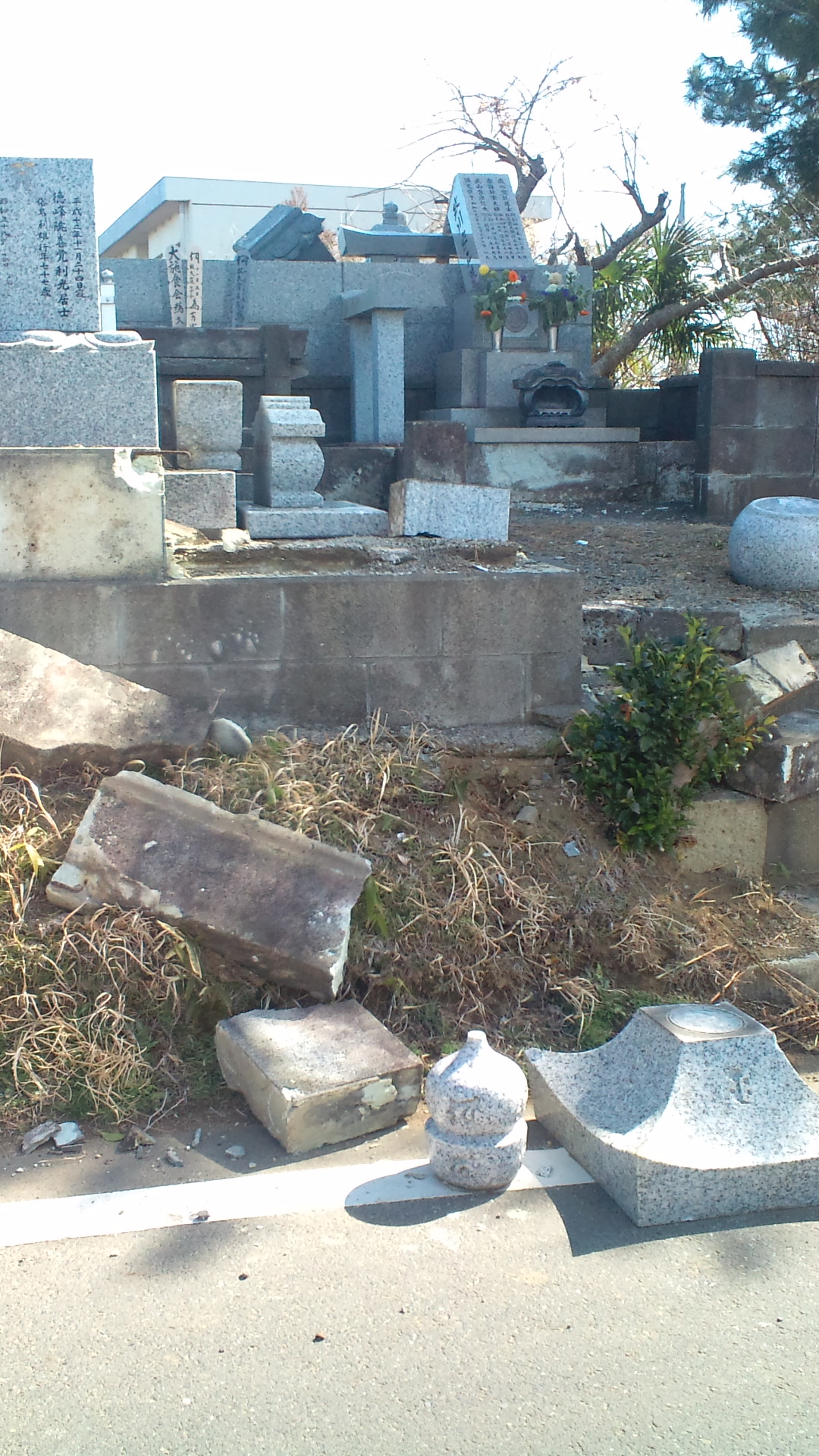 もしかすると、私が住んでる所の建造物の最大の被害は墓地かもしれないと思いました。墓石ってセメント的な接着剤で止められてるだけで、基本石を乗せただけのものなんですね。黒御影石が随分頑丈なようで、ブロック塀を破壊して倒れてました。