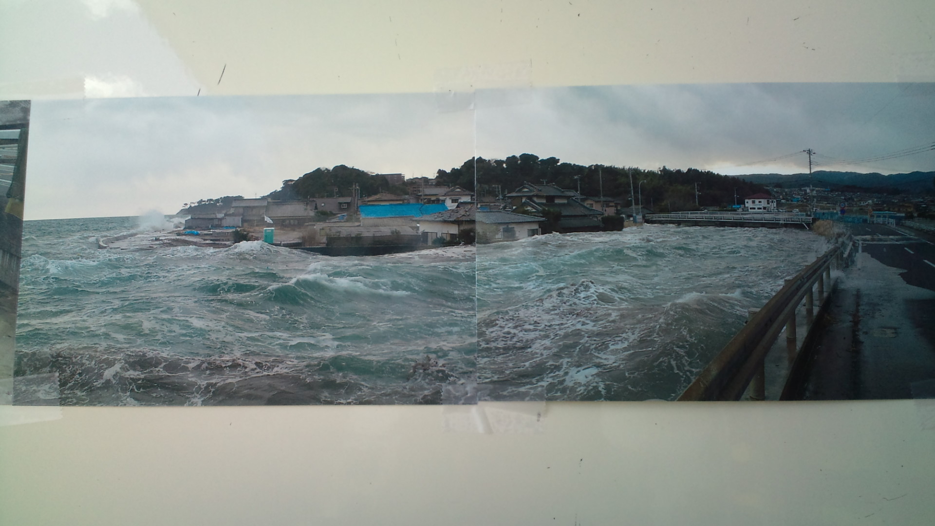 市役所の入り口に展示されていた写真。河口付近の津波の様子が映されている。
