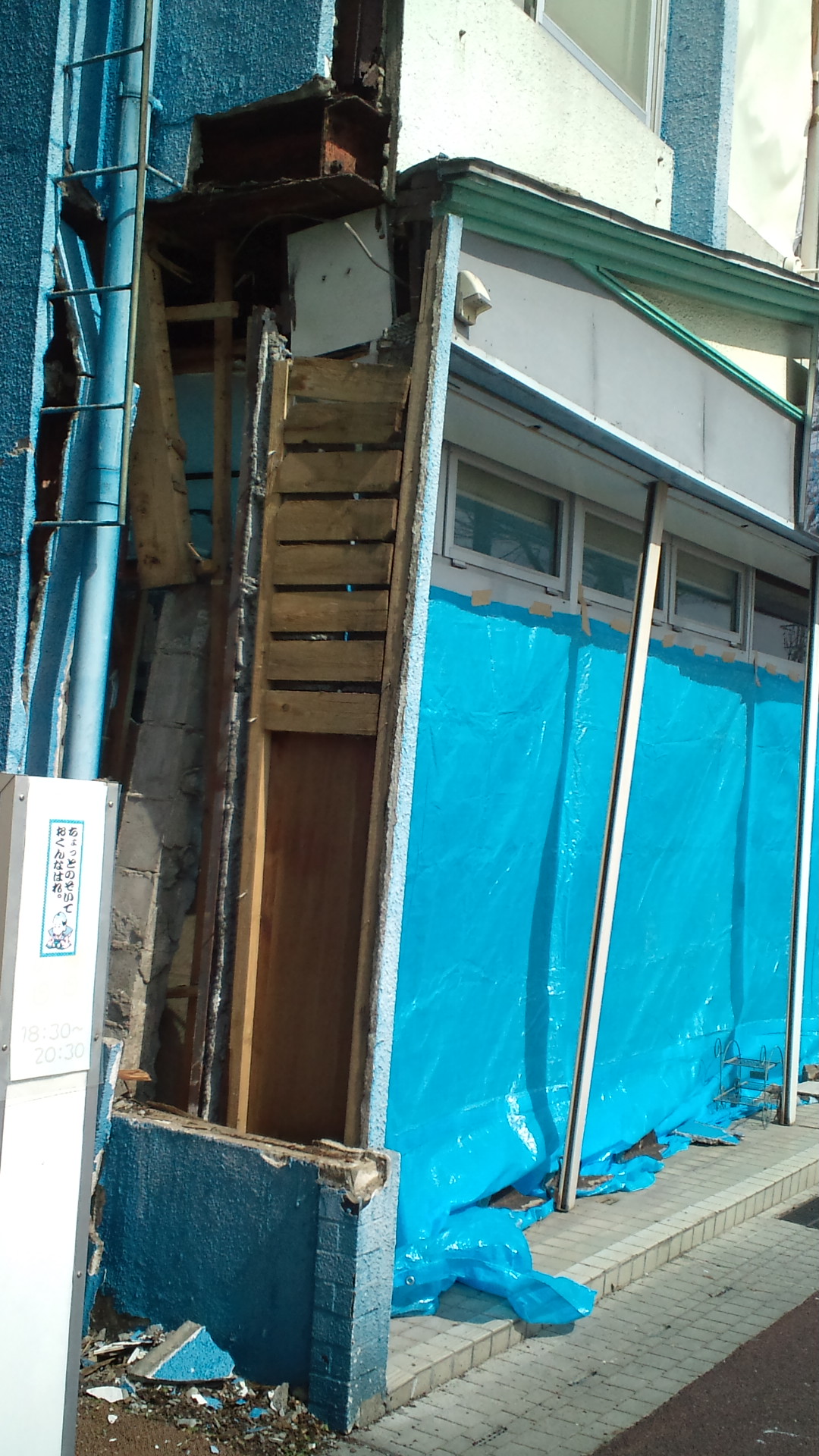 震災直後に損壊のひどかった店の様子を見に行ってみると、ブルーシートで覆われていた。数ヵ月後、こちらのお店は建て壊しになり、別な場所に移転する。